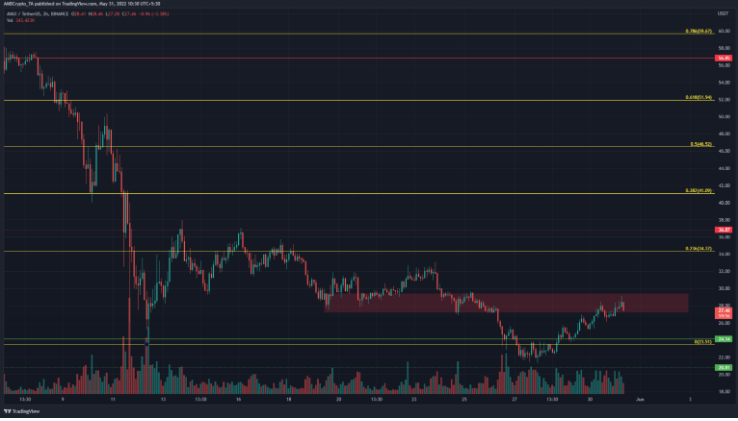 თუმცა, შაბათ-კვირის განმავლობაში, ბიტკოინის ხარებმა შეძლეს დაძლიონ დიაპაზონი 28,3 ათას დოლარამდე დაცემის შემდეგ, ხოლო ზვავი იზრდებოდა ფასების დიაგრამებზე კრიპტო მეფის გვერდით. AVAX-მა მხარდასაჭერად გადააბრუნა $24.14 და პრესის დროს ვაჭრობისას $28 წინააღმდეგობის ზონაში (წითელი ყუთი) ივაჭრებოდა.