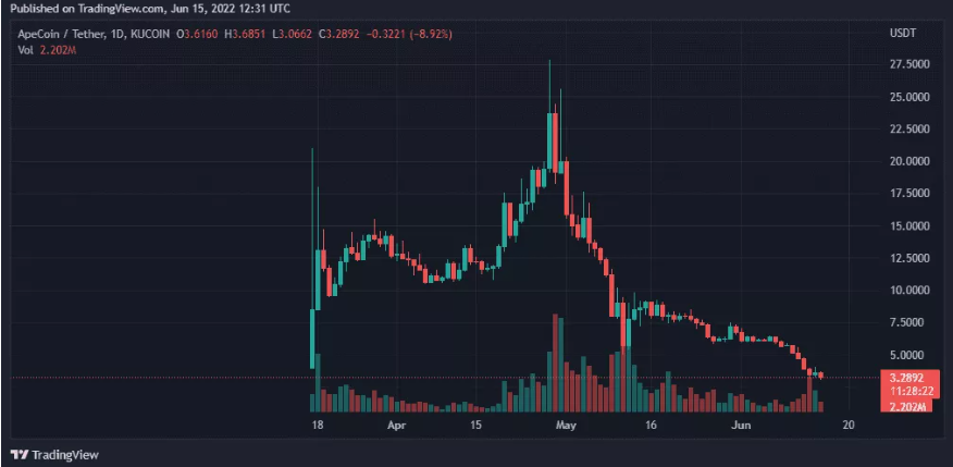 ApeCoin შეუერთდა bearish კლუბს, რადგან მისი დანაკარგები გაიზარდა. ბოლო გაყიდვებმა გამოიწვია 4.63% ზარალი ბოლო 24 საათის განმავლობაში. შედარებისთვის, ბოლო შვიდი დღის ზარალი დაახლოებით 44,88%-ია. ზარალის ზრდამ შეცვალა მისი ფასი $3,31-მდე.